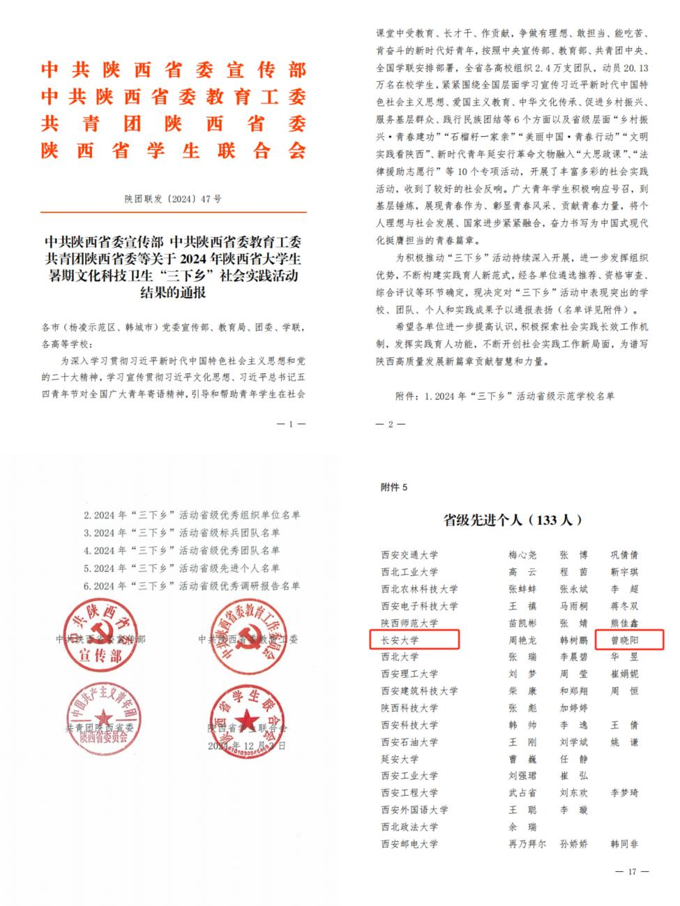 近日,中共陕西省委宣传部、中共陕西省委教育工委、共青团陕西省委等相关部门联合发布了《关于2024年陕西省大学生暑期文化科技卫生“三下乡”社会实践活动结果的通报》,吃瓜 团委书记曾晓阳获评2024年陕西省暑期“三下乡”社会实践活动先进个人称号。作为学院共青团主要负责人,曾晓阳积极响应校团委号召,认真组织,充分调动学院全体师生的积极性、主动性和创造性,在学院仅3个本科生年级360余人的情况下,共组建12支队伍,其中校级立项5支(...