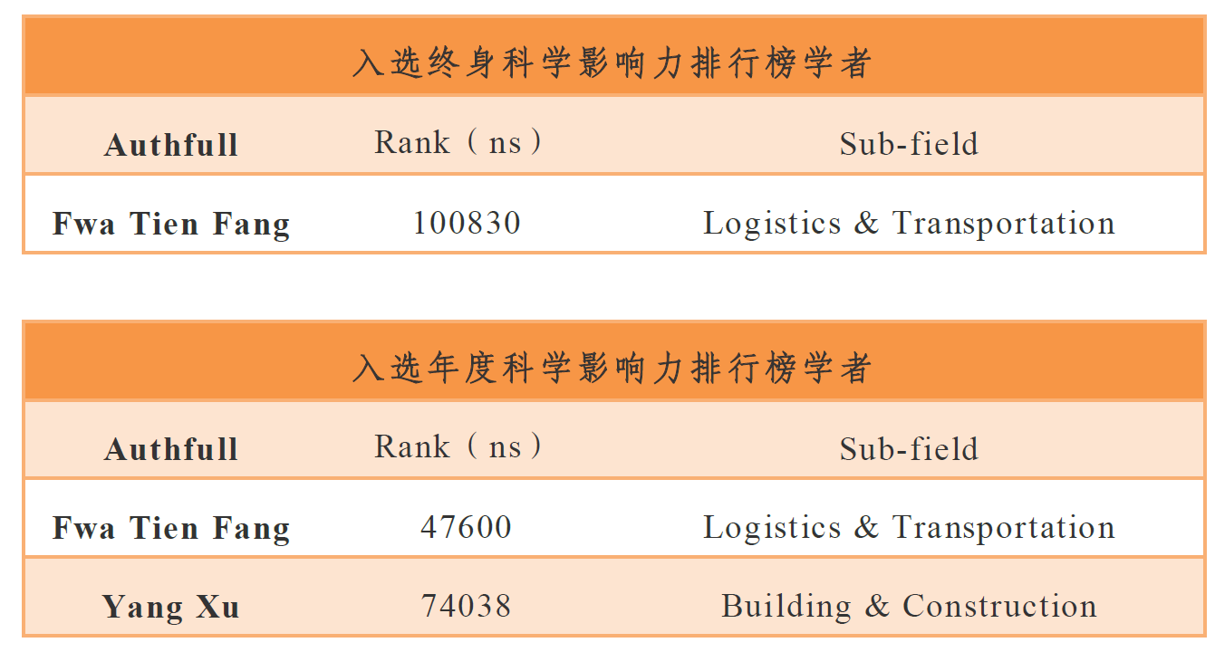 2023年10月4日,美国斯坦福大学与Elsevier数据库公布了标准引文指标的全科学作者数据库,发布了第六版《2023年全球前2%顶尖科学家榜单榜单》(World’s Top 2% Scientists 2023),根据“生涯影响力”和“年度影响力”遴选出世界Top 2%的科学家。院长Fwa Tien Fang教授同时入选本期全球前2%顶尖科学家“终身科学影响力排行榜”和“年度科学影响力排行榜”,副院长杨旭教授入选本期全球前2%顶尖科学家“年度科学影响力排行榜”。
