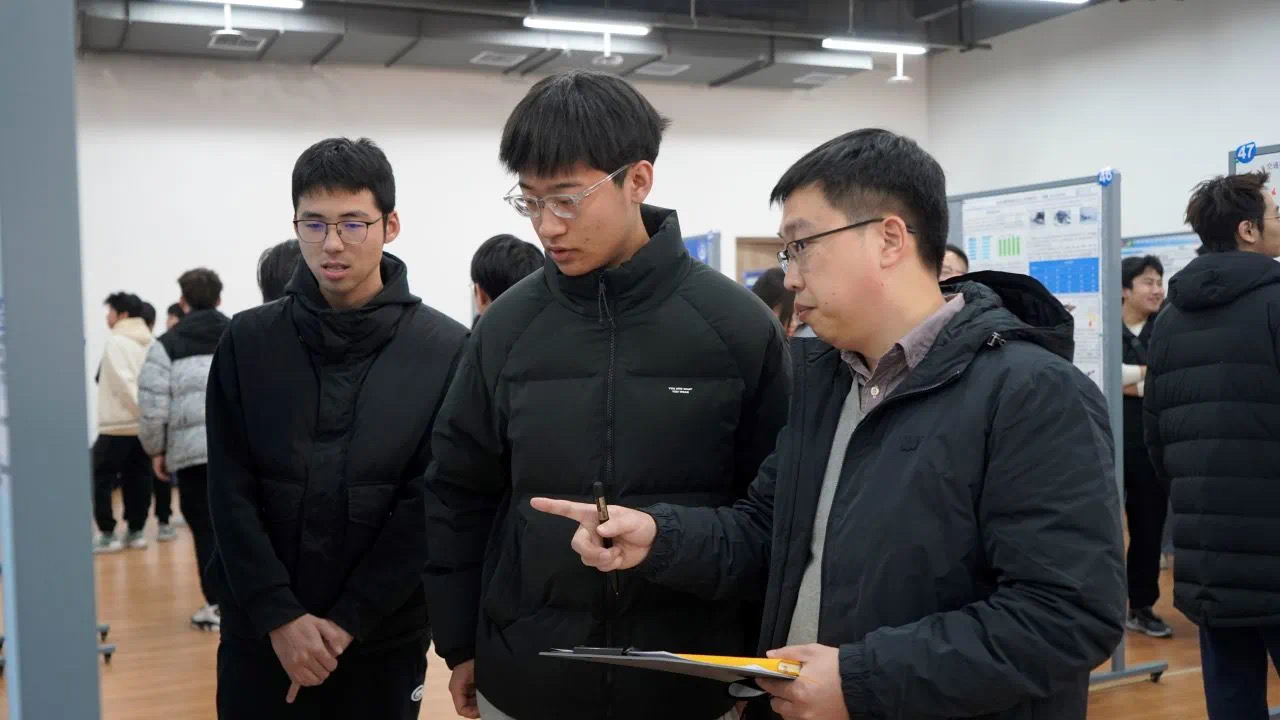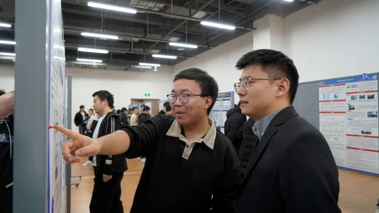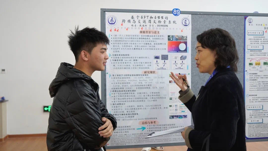 随后,海报作者现场分别从论文研究背景意义、国内外研究现状、研究方法及已有成果等方面进行集中汇报展示,评审老师根据海报内容和设计思路进行提问,对海报亮点给予肯定,并指出其不足之处。学院其他年级同学分批次集中观展,担任大众评审,借此机会互相交流探讨,现场气氛热烈。