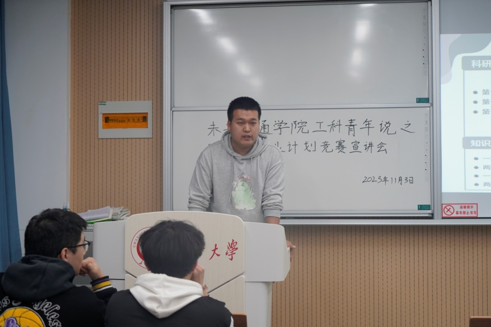 大学生科技创新创业协会于北校区WX2102教室举办工科青年说之“挑战杯”创业计划竞赛宣讲会。此次宣讲会邀请运输工程学院大学生科技创新创业协会主席张明珠、信息工程学院2022级研究生董世浩主讲,吃瓜