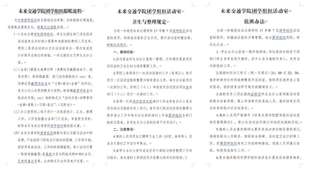 团学组织活动室使用管理规定》等制度文件10余项,从机构设置、运行机制、工作内容、工作方式、队伍建设等方面入手,落实改革方案的各项要求,不断增强组织工作效能和工作实效。