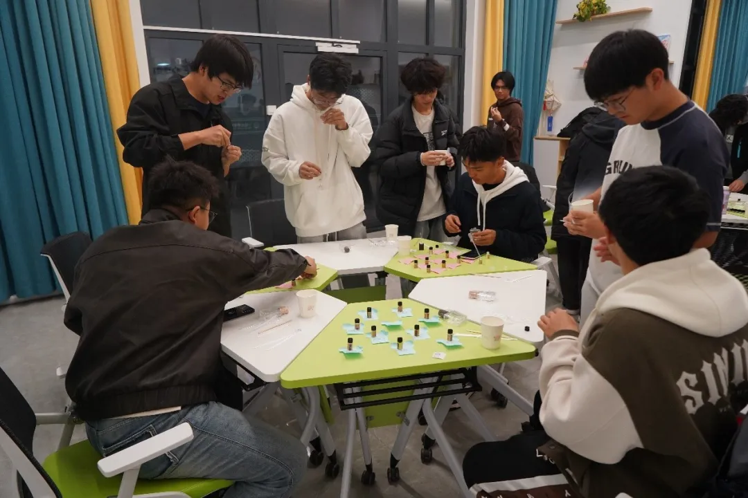 活动室中充盈着各种香水味,或兰花或蓝风铃,交织在一起,编织了今晚的梦。同学们发挥着自己的想象,将香味调和在一起。当最后一滴调和出来的香水落入瓶中,对它的创造者而言,艺术已成。