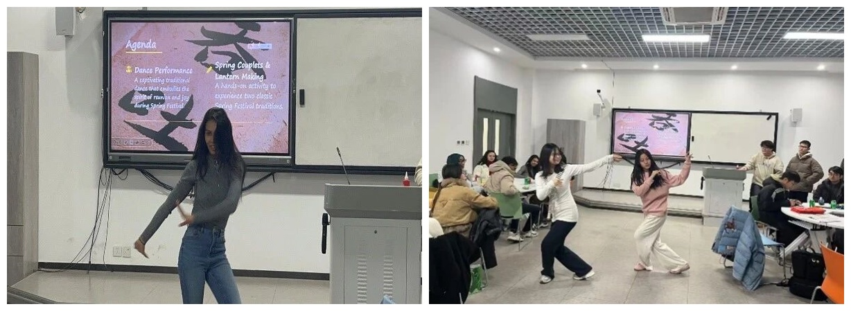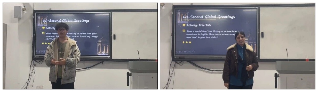 民俗体验之后,自由交流环节如期进行。同学们围绕“家乡的新年”为主题展开热烈讨论。大家纷纷用英语分享自己的春节故事,说出各自家乡最具代表性的新春祝福,教一句自己家乡方言的“新年快乐” 并探讨不同地区的年俗差异,在轻松愉快的互动中锻炼了英语表达能力,也进一步明晰了春节文化的丰富内涵。