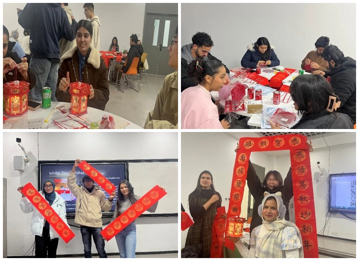 主题活动为同学们期待已久的写春联、做灯笼民俗体验环节。现场准备了红纸、毛笔、灯笼骨架、彩绳等丰富材料,志愿者详细讲解了春联的撰写技巧和灯笼的制作方法。同学们兴致盎然地动手实践,有的认真临摹春联上的英文祝福语,在笔墨挥洒间感受中西文化的碰撞;有的专注搭建灯笼骨架、装饰灯面,将对新春的美好期许融入手工创作中。活动现场欢声笑语不断,大家相互交流制作心得,在实践中加深了对春节民俗的理解。